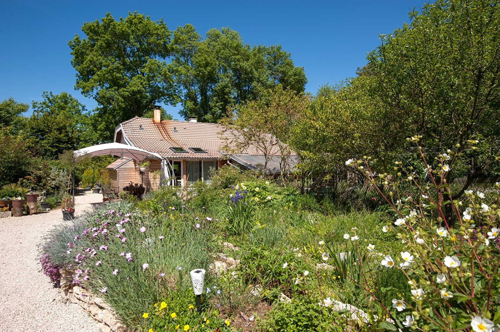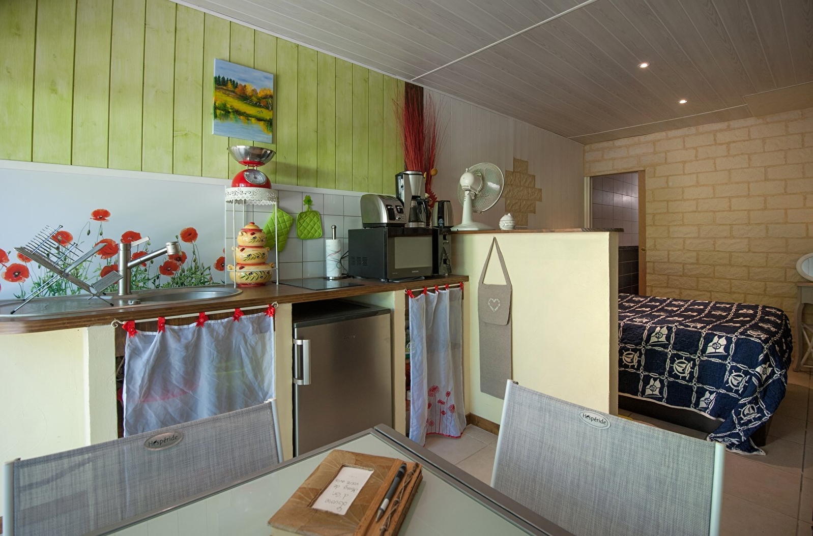 On the banks of the Doubs, as part of a house dedicated to animals and flowers, Jérôme, a professional pastry chef, has set up a single-storey guest room, with completely independent access, which can accommodate 2 people. . It is similar to a small studio, because in addition to the 140cm bed, and the shower room with WC (pocket closure), it has an equipped kitchen with dining area ("table-top" refrigerator with freezer section , combi microwave, 2 induction hobs, coffee maker, kettle, toaster, and suitable crockery). TV, DVD player and WIFI Internet. Private terrace overlooking the garden and the river. Breakfast can be taken in the kitchen area of your room, or in the owners' dining room. Possibility of ordering menus prepared by Jérôme's boutique, to be heated in your private space: starter + main course + dessert for €28 (children's menu up to 12 years old: €10). Many animals on site: ornamental ducks, geese, water birds, dogs and cats. Possibility of accessing the owners' washing machine. Access to the owners' swimming pool (pool: width 3m80 / length 7m50 / progressive depth after 3 steps, the last of which goes completely around the pool, from 1m10 to 1m80, ambient night lighting possible. Le Doubs is at the foot of the house : fishing on site! DEGRESSIVE RATES FROM 1 WEEK IN “GITE” FORMULA (without breakfast). Possibility of renting gîte formula per night: 90€/2pers. or 85€/1pers. with breakfast ( bed and breakfast formula) - 85€/2 people or 80€/1 person without breakfast (gîte formula).