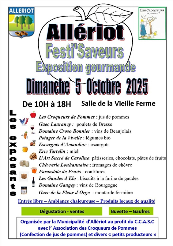 Allériot is the venue for a gourmet exhibition organised by the municipality of Allériot in aid of the C.C.A.S.C. with the Association des Croqueurs de Pommes (making apple juice) and various producers. Tastings of the products on display will be available.